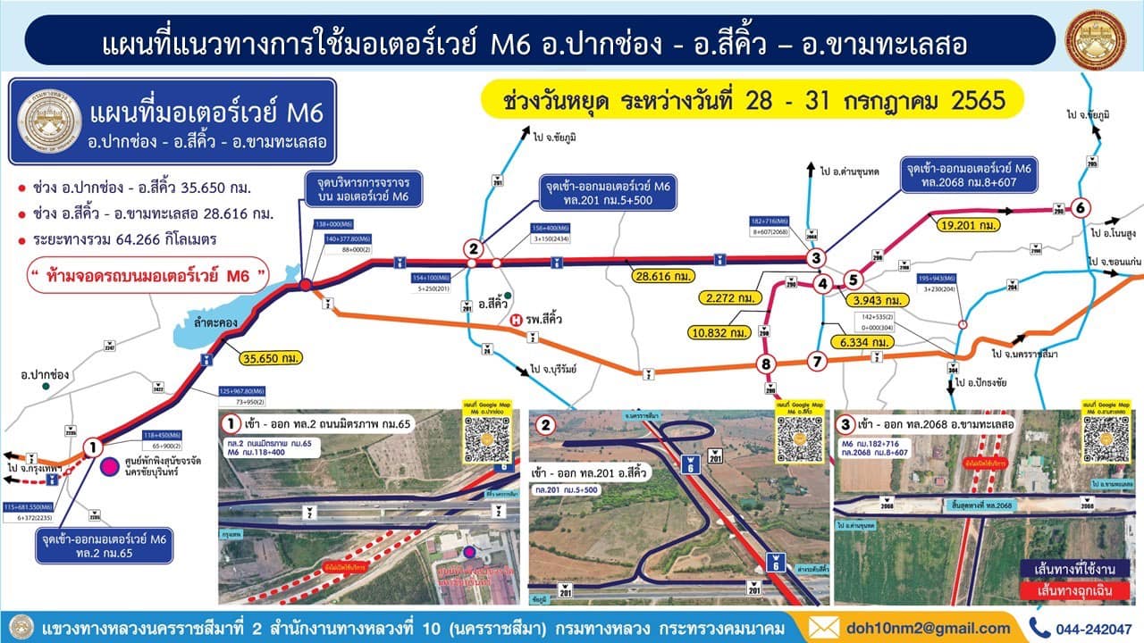 สำหรับการบริหารการจราจรมอเตอร์เวย์ M6 ช่วง ปากช่อง - สีคิ้ว - ขามทะเลสอ ช่วงขาออกวันที่ 28 – 29 กรกฎาคม 2565 และขาเข้าวันที่ 30 – 31 กรกฎาคม 2565 มีรูปแบบการให้บริการเดินรถทางเดียว โดยจะเปิดช่องจราจรด้านขวาทาง (ด้านขาเข้า) จำนวน 2 ช่องจราจรเท่านั้น สำหรับช่องจราจรด้านซ้ายทาง (ด้านขาออก) จะสงวนไว้ใช้สำหรับบริการฉุกเฉินเฉพาะเจ้าหน้าที่เท่านั้น โดยเปิดให้บริการมีจุดเข้า – ออกตามแผนที่ดังนี้