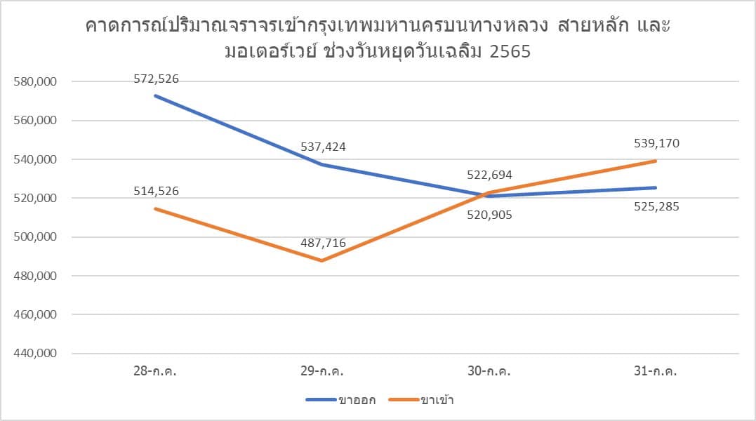 อธิบดีกรมทางหลวงกล่าวต่อไปว่าสำนักอำนวยความปลอดภัยได้คาดการณ์ปริมาณจราจรเข้าออกกรุงเทพมหานคร บนทางหลวงสายหลักและมอเตอร์เวย์จำนวน 10 เส้นทาง ในช่วงวันหยุดยาวช่วงวันเฉลิมพระชนมพรรษาฯ ระหว่างวันที่ 28 - 31 กรกฎาคม 2565 รวมทั้งสิ้น 4,220,246 คัน โดยแบ่งเป็นขาออก 2,156,140 คัน และขาเข้า 2,064,106 คัน ซึ่งคาดว่าวันที่ 28 กรกฎาคม 2565 จะมีปริมาณจราจรขาออกสูงสุดประมาณ 572,526 คัน และวันที่ 31 กรกฎาคม 2565 จะมีปริมาณจราจรขาเข้ากรุงเทพมหานครสูงสุดประมาณ 539,170 คัน จึงขอให้ประชาชนวางแผนการเดินทาง ติดตามข่าวสาร ตรวจสอบความพร้อมของรถก่อนเดินทาง