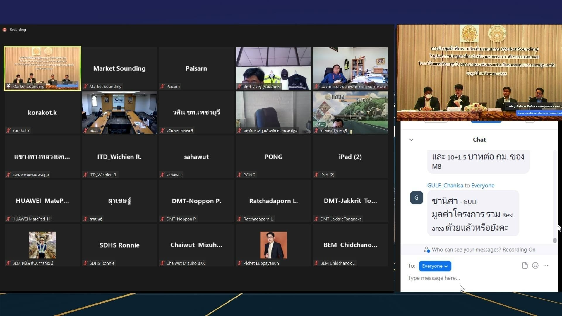 ด้าน ดร.ธนศักดิ์ วงศ์ธนากิจเจริญ ผู้อำนวยการกองทางหลวงพิเศษระหว่างเมือง กล่าวต่อว่า ในช่วงเช้าของวันเดียวกัน (19 ส.ค. 65) ยังมีการจัดประชุมรับฟังความคิดเห็นการทบทวนผลการศึกษาความเหมาะสมในการให้เอกชนร่วมลงทุน หรือ PPP ทางหลวงพิเศษระหว่างเมืองหมายเลข 8 สายนครปฐม-ชะอำ เพื่อรับฟังความคิดเห็นและข้อเสนอแนะจากภาคเอกชนและนักลงทุน (Market Sounding) เพื่อการพิจารณารูปแบบการร่วมลงทุนโครงการ ในรูปแบบการประชุมทางไกลโดยมีผู้สนใจเข้าร่วมกว่า 160 คน ประกอบด้วย สถาบันการเงิน ที่ปรึกษาการร่วมลงทุน ผู้แทนจากกลุ่มผู้รับเหมา หน่วยงานราชการและหน่วยงานรัฐวิสาหกิจ สถานเอกอัครราชทูตประจำประเทศไทย ภาคเอกชน รวมถึงหอการค้าต่างประเทศในประเทศไทย เข้าร่วม สำหรับโครงการ การให้เอกชนร่วมลงทุน หรือ PPP ทางหลวงพิเศษระหว่างเมืองหมายเลข 8 สายนครปฐม-ชะอำ ปัจจุบันได้ดำเนินการสำรวจและออกแบบรายละเอียด และศึกษาผลกระทบสิ่งแวดล้อม (EIA) แล้วเสร็จ รวมถึงคณะกรรมการนโยบายการร่วมลงทุนระหว่างรัฐและเอกชน ได้เคยเห็นชอบในหลักการของโครงการ โดยอนุมัติให้ดำเนินโครงการฯ ในรูปแบบทางหลวงสัมปทาน ด้วยการให้เอกชนร่วมลงทุนในรูปแบบ PPP Net Cost ซึ่งการทบทวนผลการศึกษาได้เสนอให้ดำเนินการปรับปรุงรูปแบบโครงการในส่วนต่าง ๆ เพื่อลดค่าลงทุนโครงการ รวมถึงผลกระทบต่อประชาชน เช่น การปรับรูปแบบโครงการจากถนนระดับดินบนเข็มเป็นรูปแบบสะพานบก ซึ่งช่วยลดผลกระทบทางด้านการเวนคืนที่ดินของประชาชน ลดค่าก่อสร้าง การนำระบบ M-Flow มาใช้กับโครงการแทนการจ่ายเงินที่พนักงาน และลดปัญหาการจราจรติดขัดบริเวณด่านจัดเก็บค่าธรรมเนียมผ่านทาง เพื่ออำนวยความสะดวกให้แก่ให้ผู้ใช้ทาง เป็นต้น ซึ่งสามารถลดมูลค่าก่อสร้างได้กว่า 3,200 ล้านบาท คิดเป็นประมาณ 4.3% เมื่อเทียบกับการศึกษาครั้งที่ผ่านมา รวมถึงมีแนวคิดที่จะทำการก่อสร้างเป็นช่วง เพื่อให้โครงการสามารถพัฒนาได้อย่างรวดเร็ว ตอบสนองต่อความต้องการในการเดินทางและขนส่งสินค้าที่เพิ่มมากขึ้นอย่างต่อเนื่อง