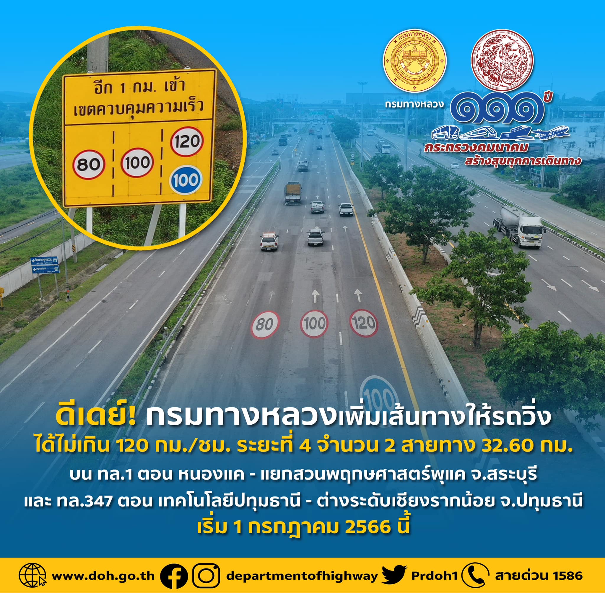 กรมทางหลวง เพิ่มเส้นทางให้ใช้ความเร็ว 120 กม./ชม. เพิ่มเติม จำนวน 2 เส้นทาง ระยะทางรวม 32.60 กม. เริ่ม 1 กรกฎาคม 2566 นี้