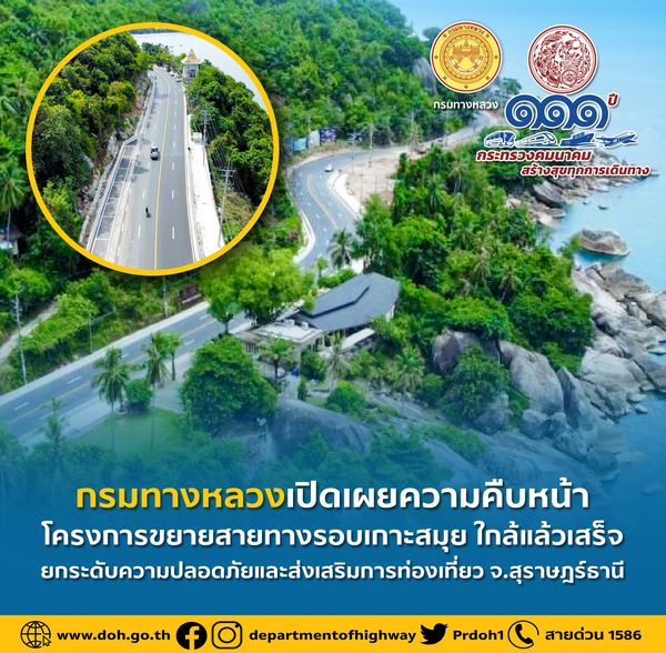 กรมทางหลวงเปิดเผยความคืบหน้าโครงการขยายสายทางรอบเกาะสมุย ใกล้แล้วเสร็จ ยกระดับความปลอดภัยและส่งเสริมการท่องเที่ยว จ.สุราษฎร์ธานี
