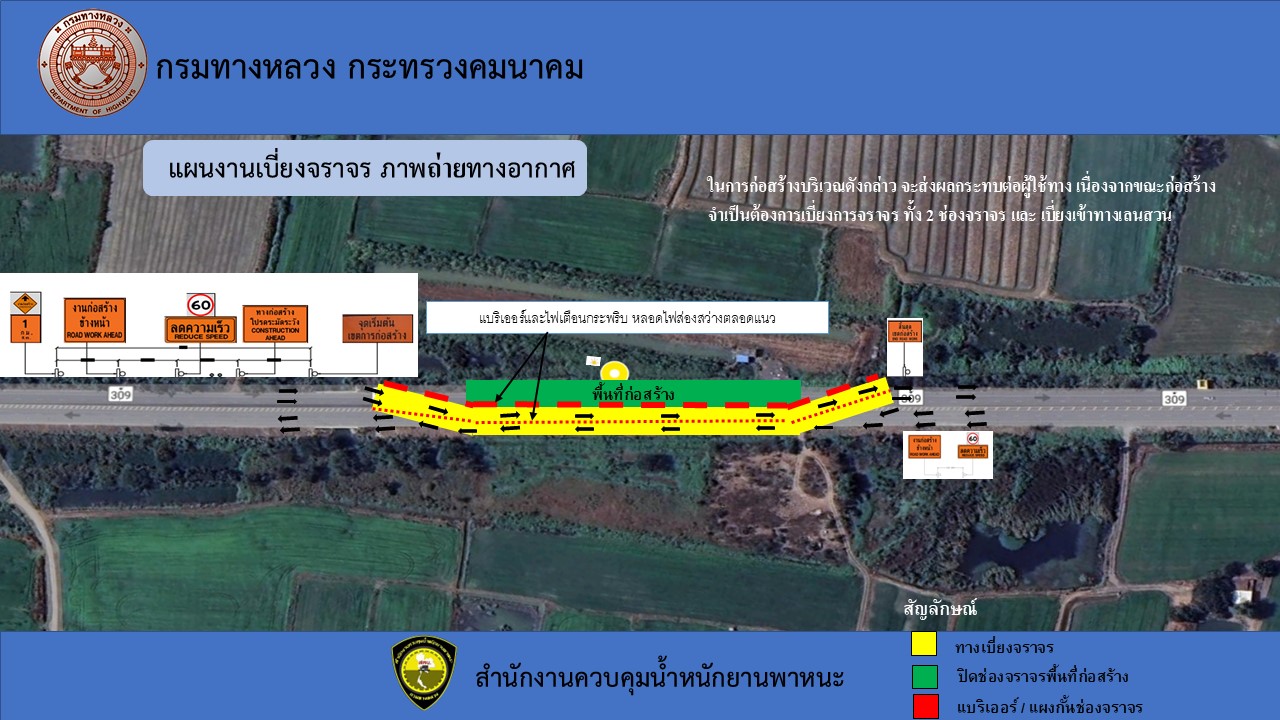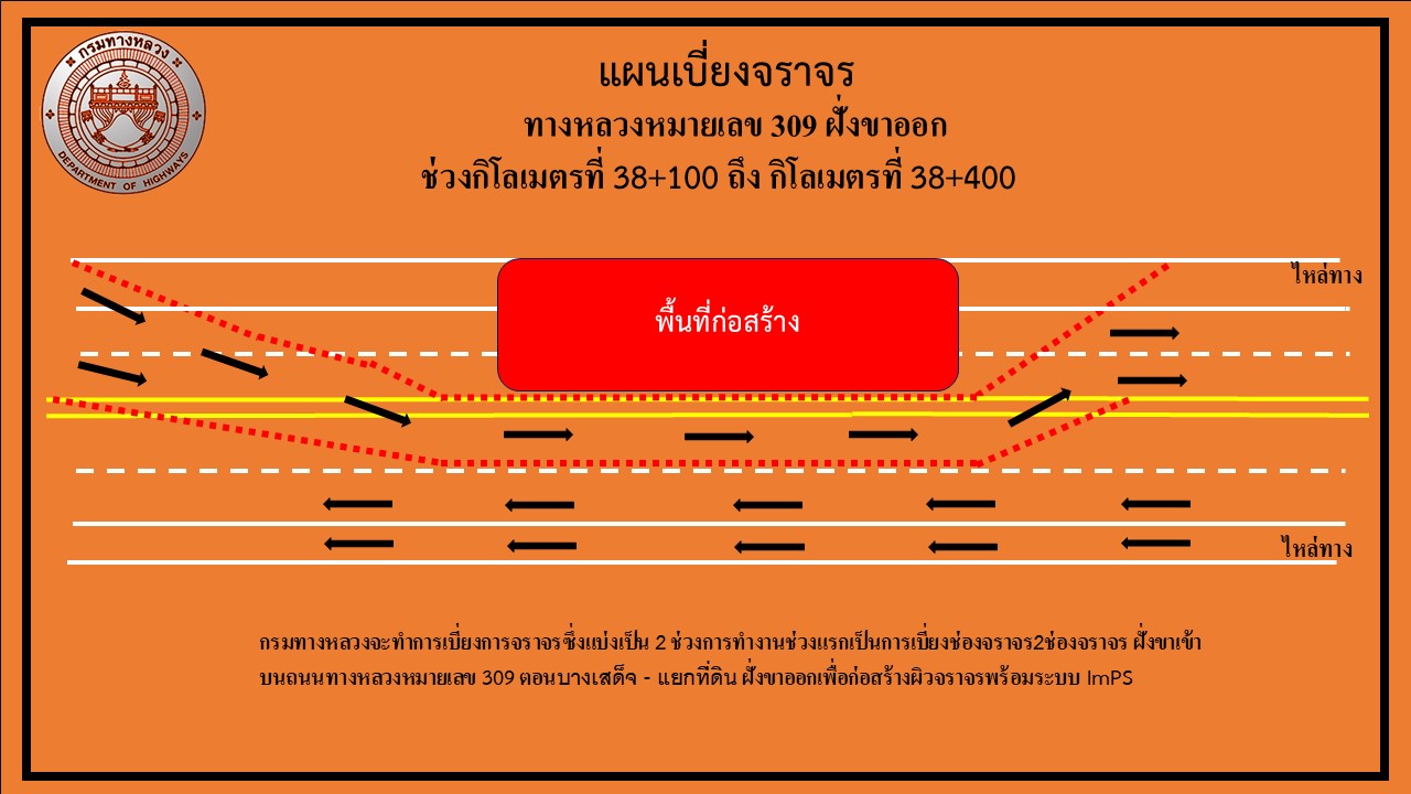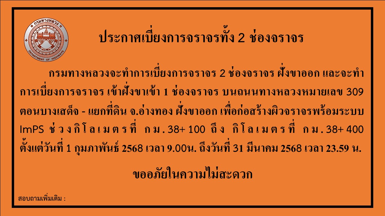 กรมทางหลวงจะทำการเบี่ยงการจราจร 2 ช่องจราจร ฝั่งขาออก และจะทำการเบี่ยงการจราจร เข้าฝั่งขาเข้า 1 ช่องจราจร บนถนนทางหลวงหมายเลข 309 ตอนบางเสด็จ - แยกที่ดิน จ.อ่างทอง ฝั่งขาออก เพื่อก่อสร้างผิวจราจรพร้อมระบบ ImPS ช่วงกิโลเมตรที่ กม.38+100 ถึง กิโลเมตรที่ กม.38+400 ตั้งแต่วันที่ 1 กุมภาพันธ์ 2568 เวลา 9.00น. ถึงวันที่ 31 มีนาคม 2568 เวลา 23.59 น.