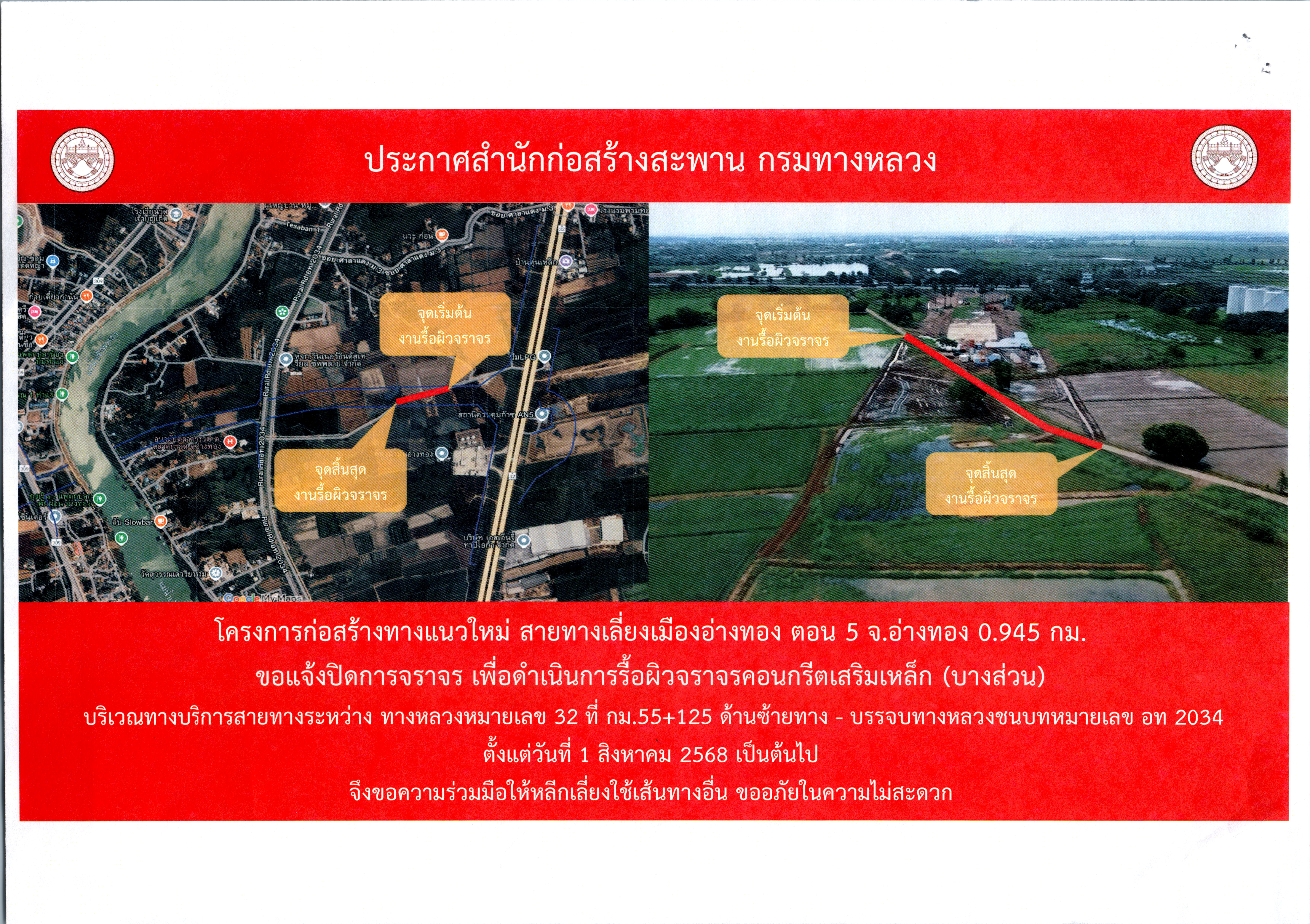 ประชาสัมพันธ์ แจ้งปิดการจราจร เพื่อดำเนินการรื้อผิวจราจรคอนกรีตเสริมเหล็ก (บางส่วน) บริเวณทางหลวงหมายเลข 32 ที่ กม.55+125 ด้านซ้ายทาง - บรรจบ ทางหลวงชนบทหมายเลข อท 2034 ตั้งแต่วันที่ 1 สิงหาคม 2568 เป็นต้นไป